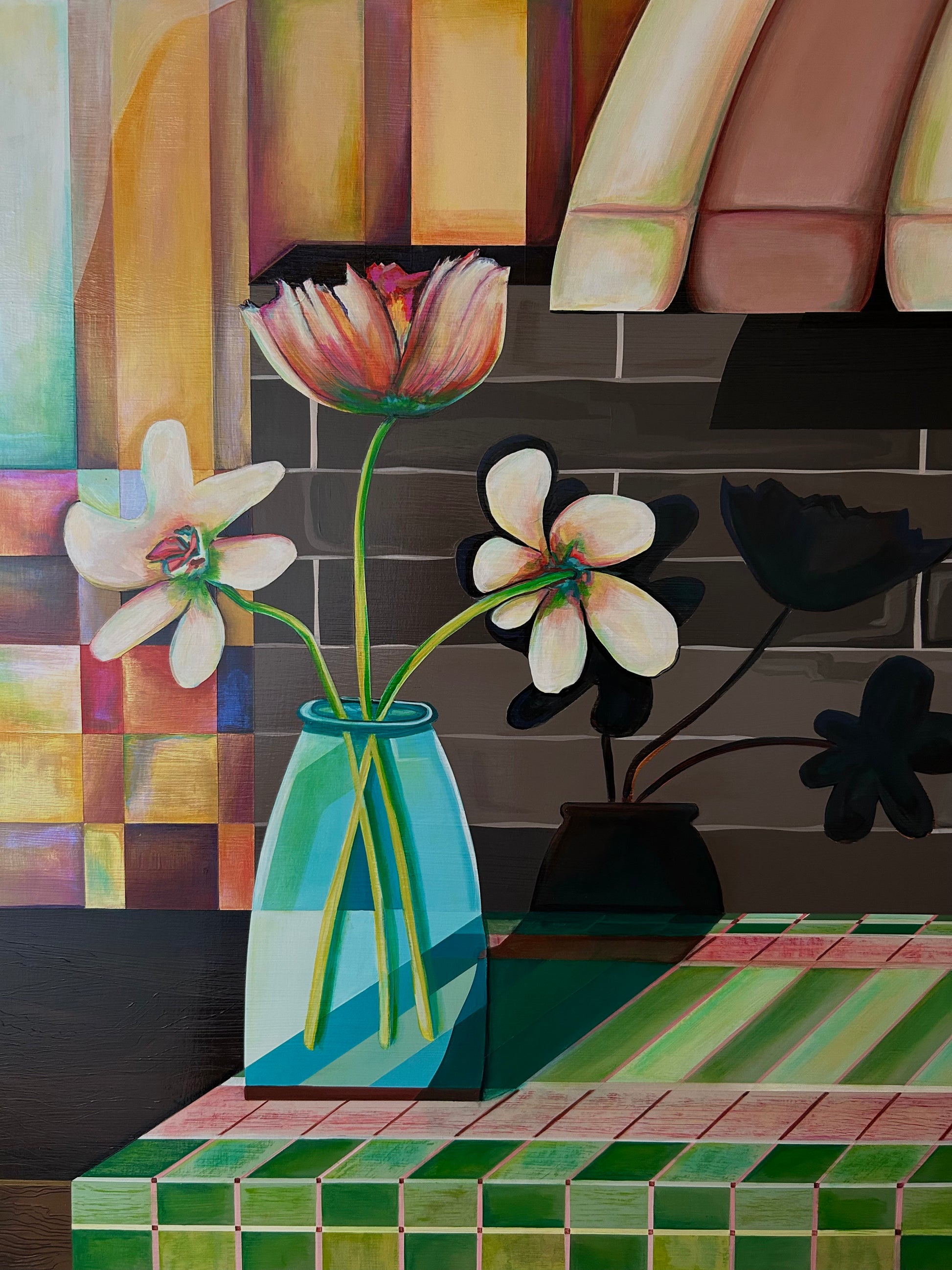 Beautiful luminescent paint gives a special glow to this painting. Throughout the day the lighting will express a different glow. The shadows are deep and rich so the light comes brightly through.