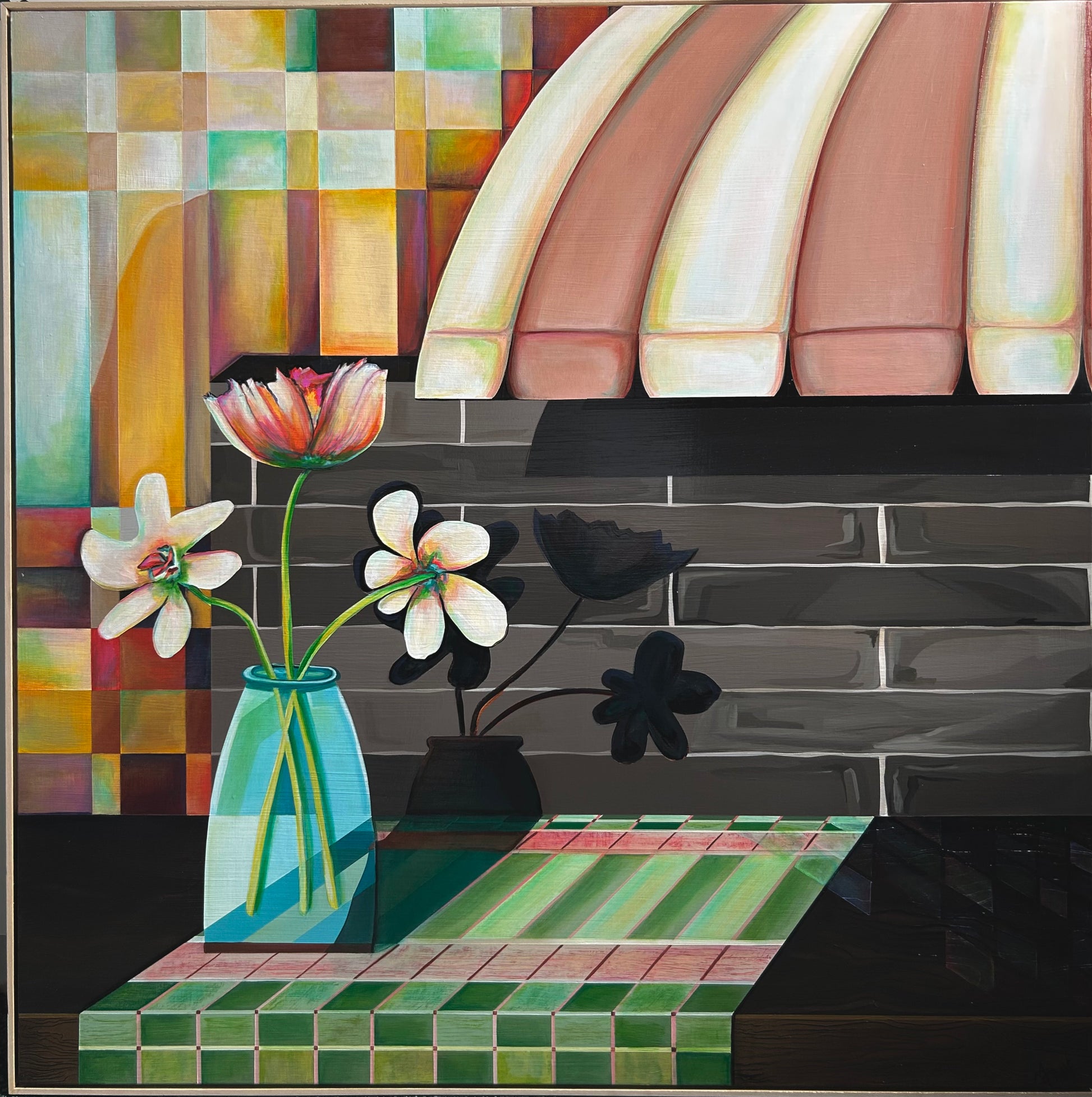 Original Acrylic painting on raised wood panel. Framed in Natural Maple.