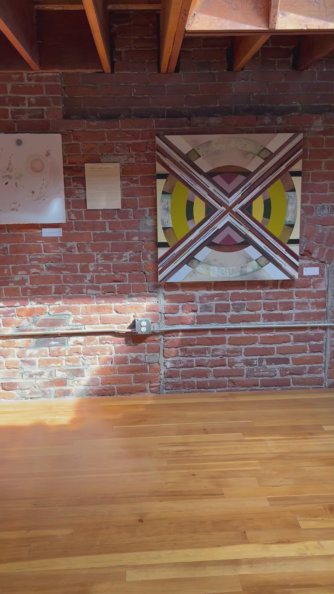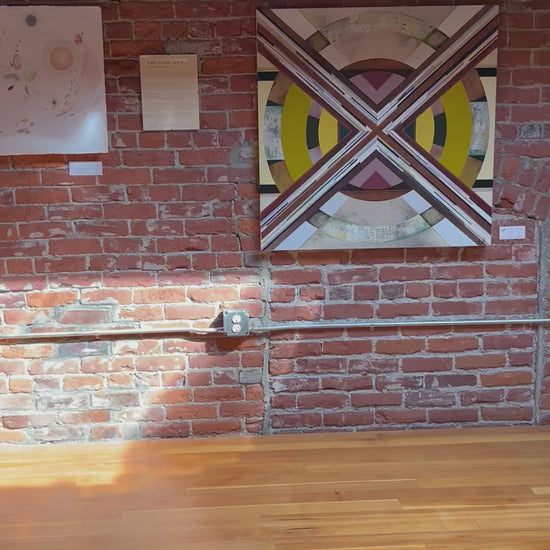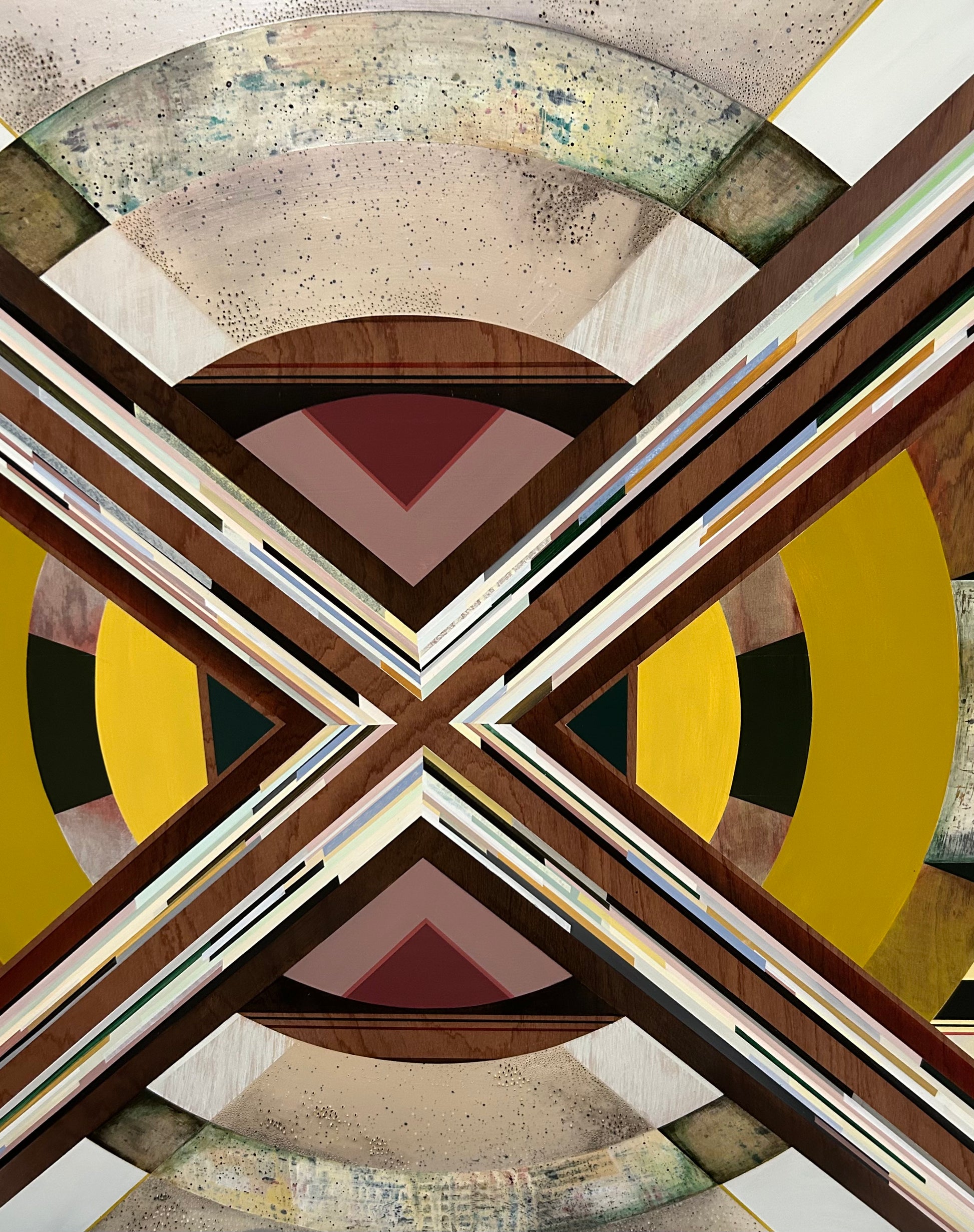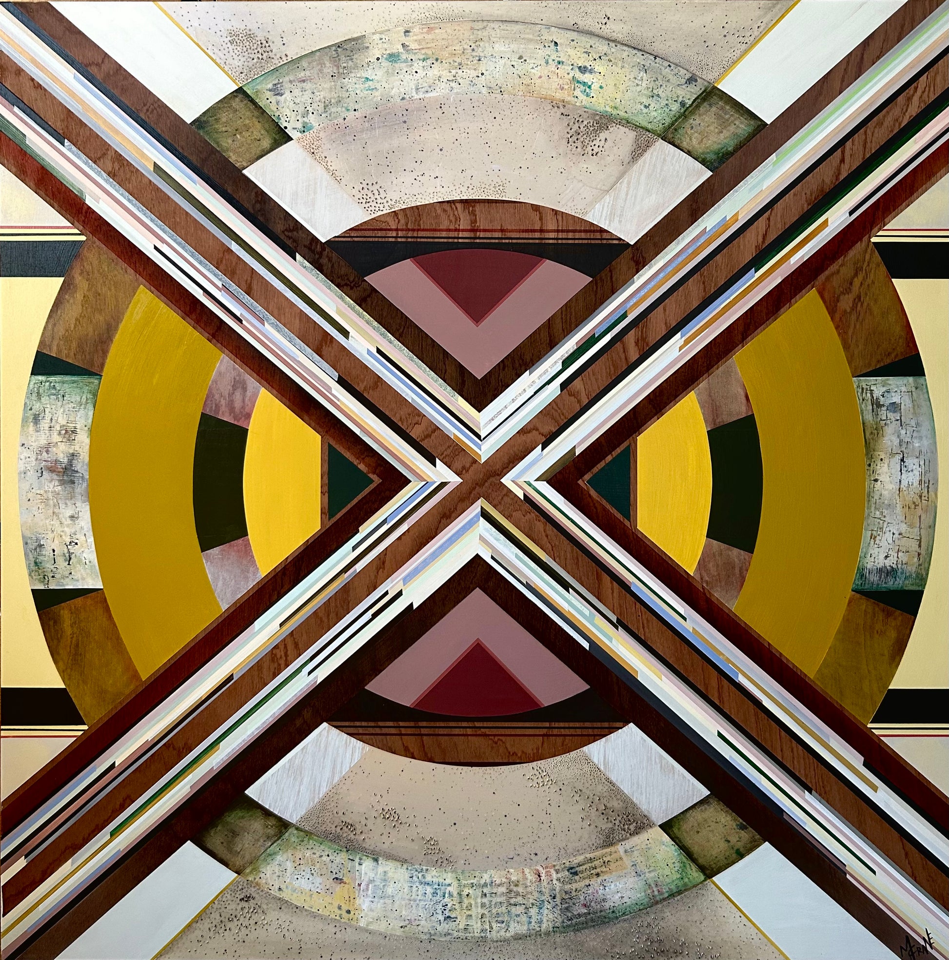 A spectacular combination of texture and detail that juxtapositions the reductive flat shapes. A unique painting that highlights the wood panel revealing the beauty of nature by the wood grain that is exposed. The results are a rustic elegance.